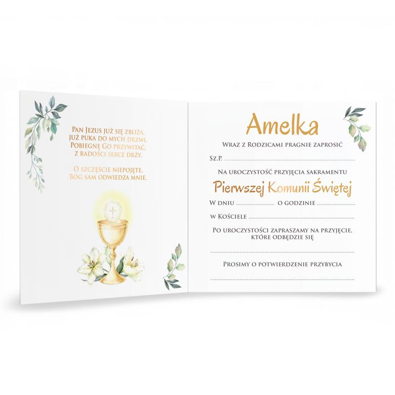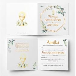 Delikatna, komunijna grafika w stylu boho i eukaliptusowym oraz subtelne złote akcenty nadają zaproszeniu uroczysty i ponadczasowy charakter, idealny na Komunię Świętą dziewczynki i chłopca.