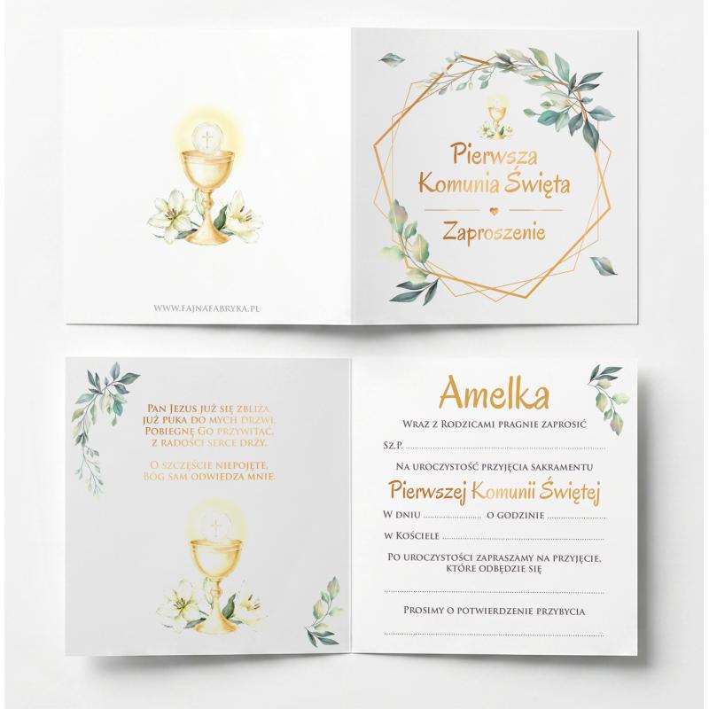 Zaproszenie na Komunię Świętą złote liście eleganckie