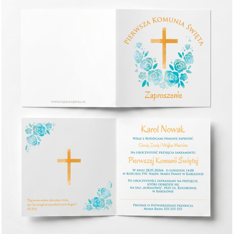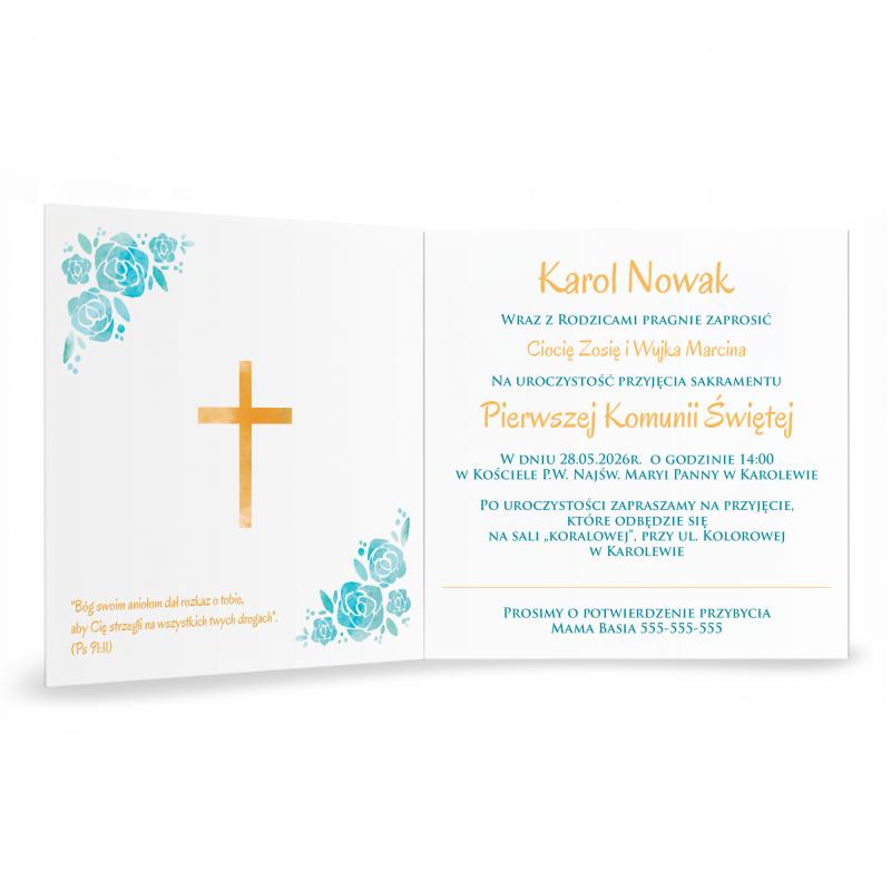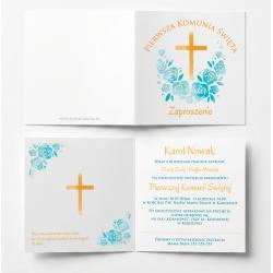 Zaproszenie na Komunię Świętą krzyż niebieskie kwiaty