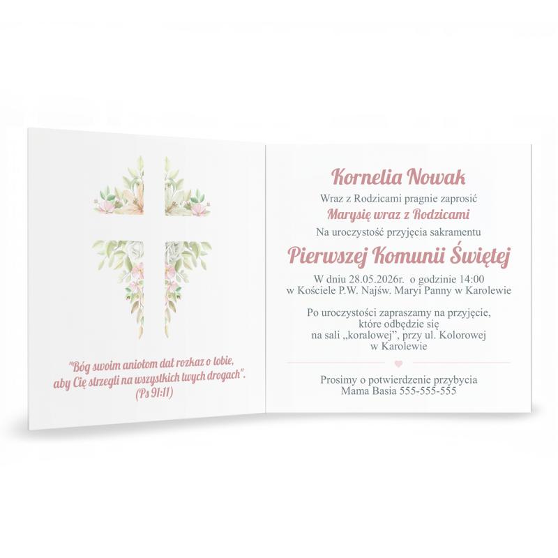 Subtelny motyw krzyża otoczonego pastelowymi kwiatami oraz wieńcem florystycznym nadaje zaproszeniu lekkości, klasy i uroczystego charakteru, idealnie wpisując się w klimat Pierwszej Komunii Świętej.
