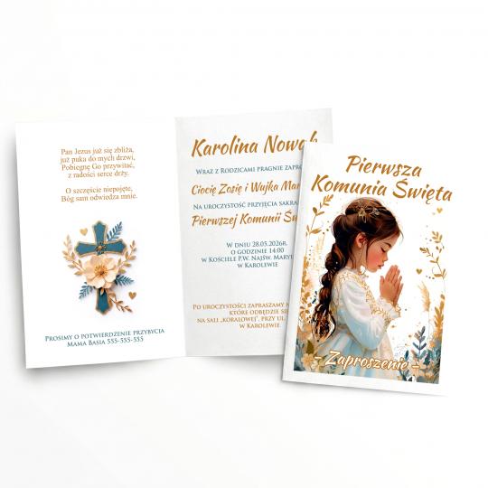 Stylowe zaproszenie na Pierwszą Komunię Świętą dla dziewczynki, utrzymane w eleganckiej kolorystyce złota, beżu i subtelnego błękitu. Front zdobi piękna ilustracja modlącej się dziewczynki, otoczona delikatnymi roślinnymi ornamentami, co nadaje całości wyjątkowo uroczysty i harmonijny charakter.