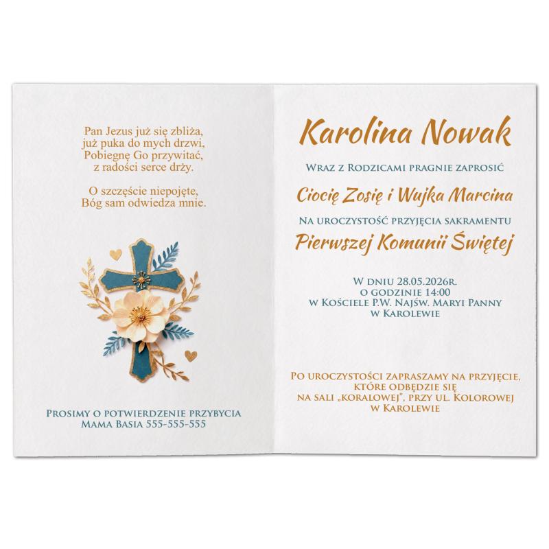 Zaproszenie doskonale sprawdzi się jako elegancka forma zaproszenia dla rodziny, chrzestnych oraz bliskich gości, a także jako pamiątka Pierwszej Komunii Świętej.