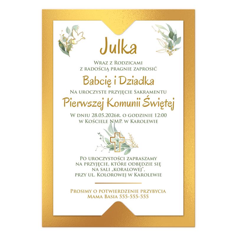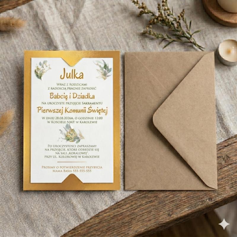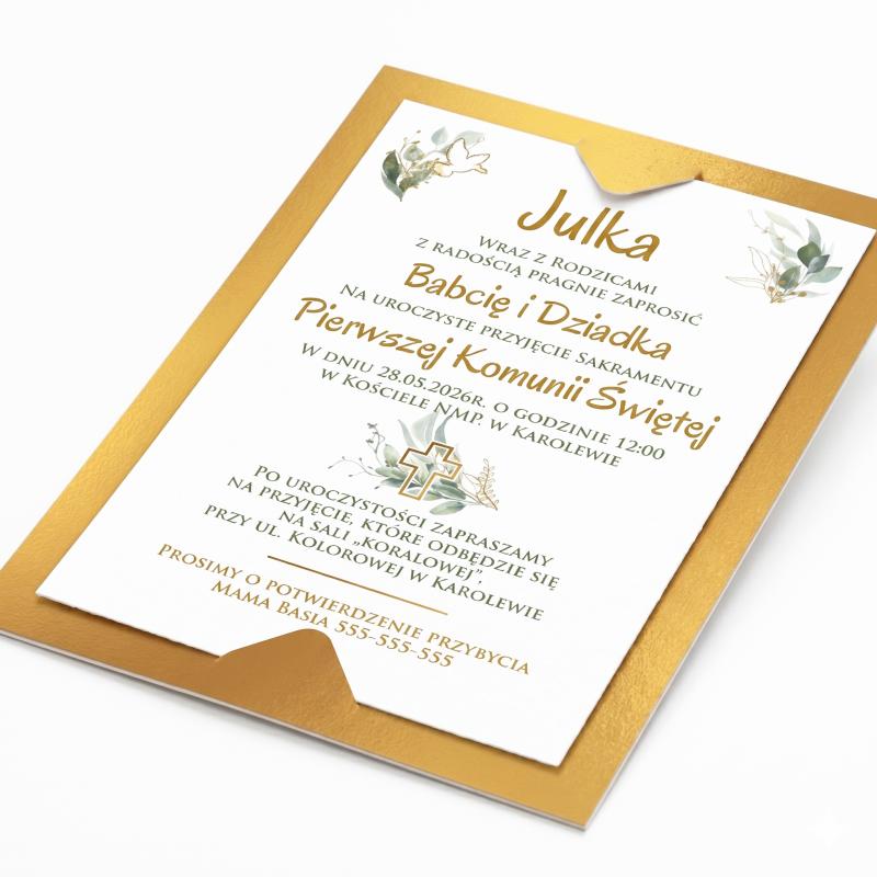 Złote zaproszenie Komunia Święta personalizowane eleganckie