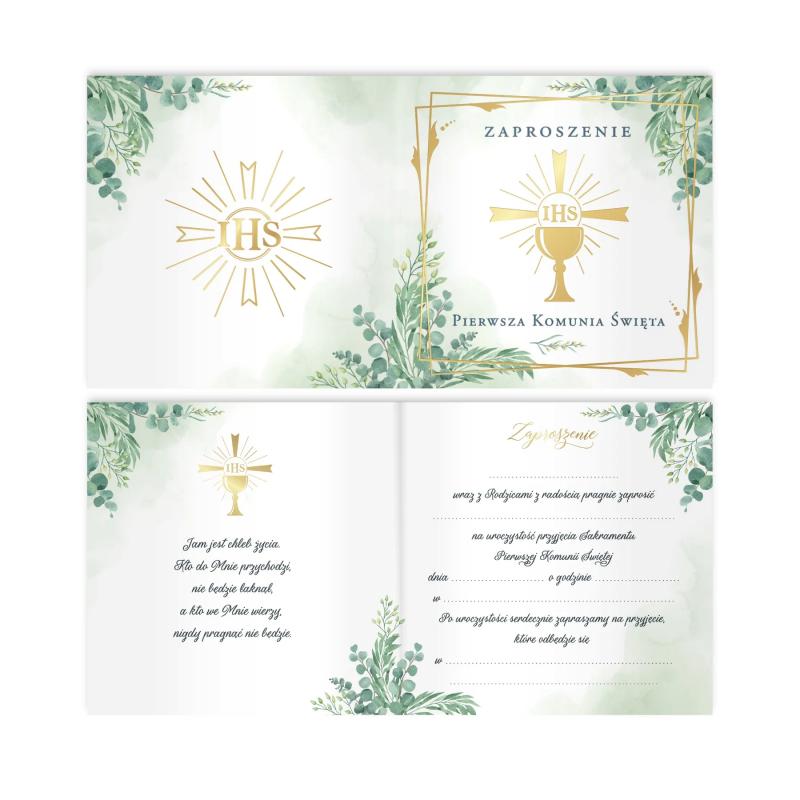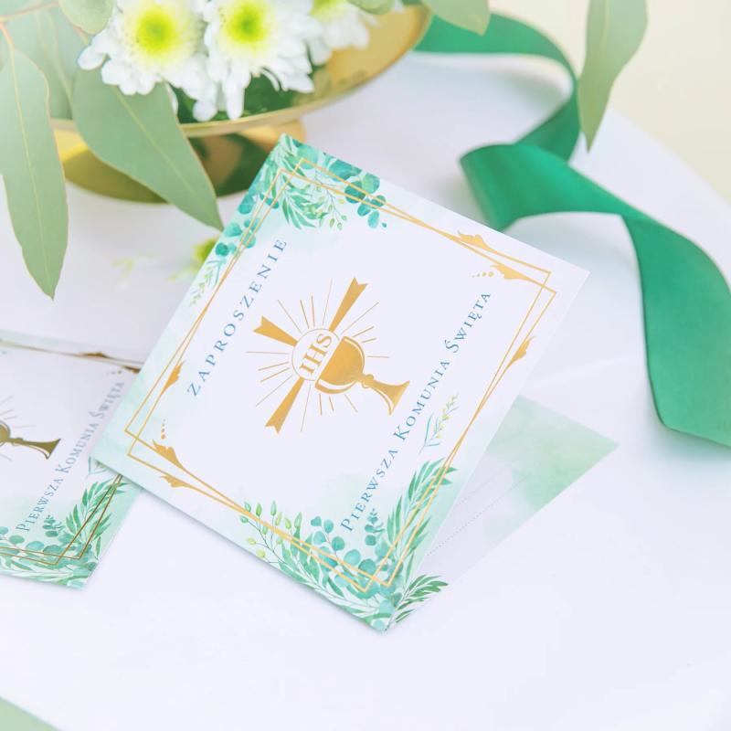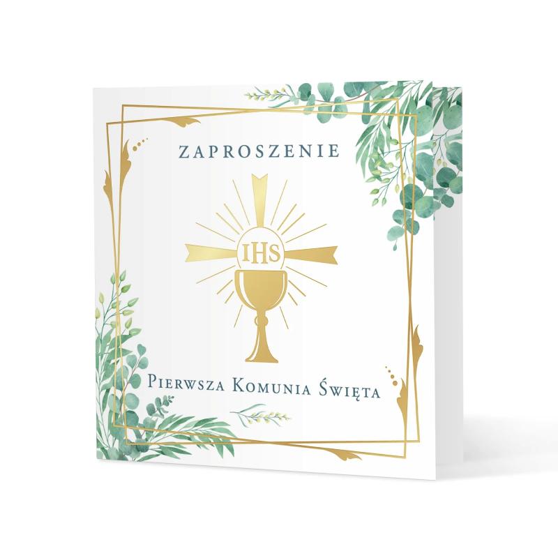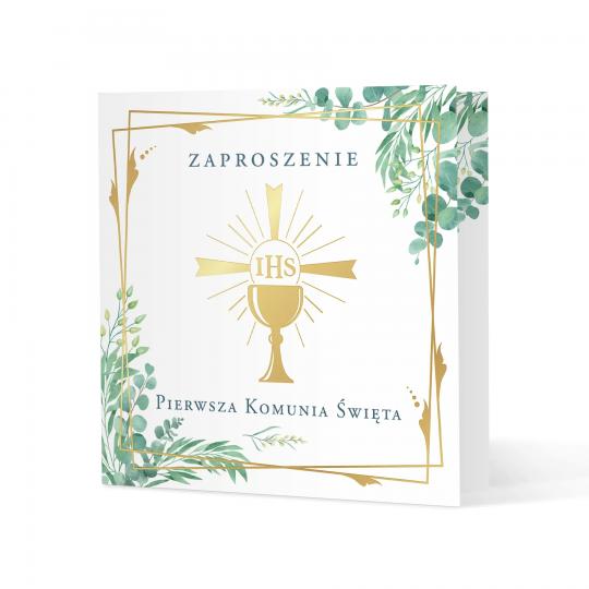 Eleganckie zaproszenie na Pierwszą Komunię Świętą ze złotymi motywami na biało-zielonym tle. Złote elementy - kielich z hostią umieszczony, w przesuniętych względem siebie ramkach, pięknie podkreślają zielone gałązki z listkami o różnych kszt.ałtach i subtelne zielone cieniowanie tła.