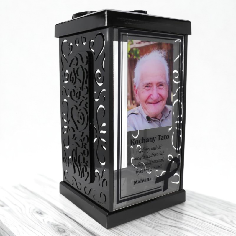 Boczne ścianki zdobią dekoracyjne ażurowe wzory, które subtelnie rozpraszają światło płomienia, tworząc wzruszający efekt refleksji. Znicz został zaprojektowany z myślą o personalizacji – posiada miejsce na zdjęcie oraz cytat, co pozwala nadać mu indywidualny i emocjonalny charakter.