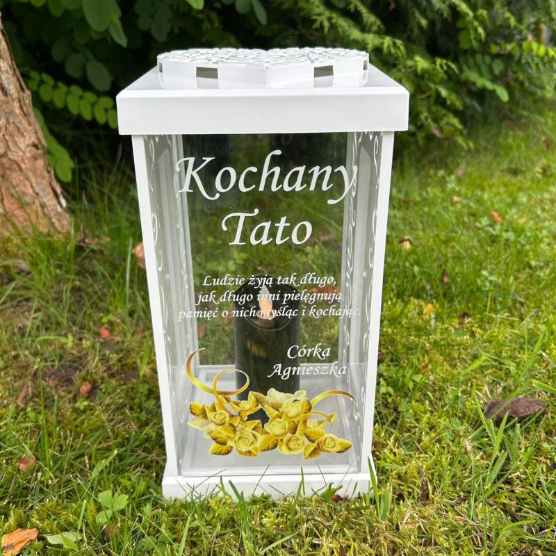 Ozdobna ażurowa obudowa w białym kolorze nadaje całości elegancki i subtelny charakter, a delikatne światło świecy pięknie przenika przez dekoracyjne wzory. Przód znicza został zaprojektowany z myślą o personalizacji – umożliwia dodanie dedykacji, dzięki czemu staje się on wyjątkową, sentymentalną pamiątką.