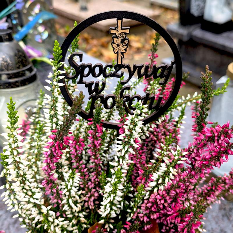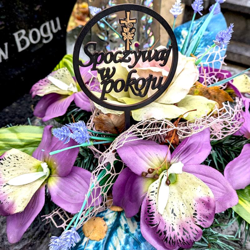 Ten topper to elegancki dodatek do kwiatów na grób, idealny na Dzień Wszystkich Świętych oraz Święto Zmarłych. Wykonany z czarnego drewna MDF, ma okrągły kształt i subtelny napis "Spoczywaj w pokoju". Dodatkowym akcentem jest delikatny motyw krzyża z różyczką, który symbolizuje pamięć oraz miłość do zmarłych.