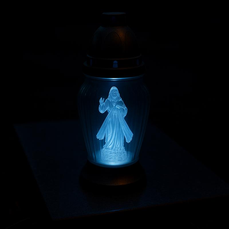 Subtelny i efektowny wkład LED z figurką Jezusa to wyjątkowy element dekoracyjny na grób, który świeci delikatnym białym światłem. Idealny na Dzień Wszystkich Świętych lub jako wyraz pamięci o bliskich przez cały rok. Pasuje do większości zniczy szklanych i latarni.