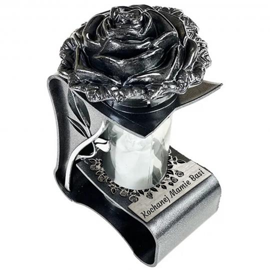 Elegancki znicz z obudową w odcieniu ciemnego grafitu i efektownym kapturem w kształcie róży. W komplecie wkład elektryczny LED emitujący chłodne, białe światło – gotowy do użycia od razu po rozpakowaniu.