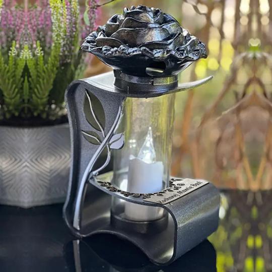 Szklany znicz z metaliczną różą na górze to wyraz delikatności i szacunku. Ażurowe detale nadają mu wyjątkowego charakteru, a solidna podstawa z motywem liścia zapewnia stabilność i trwałość. Zachwyca zarówno w dzień, jak i po zmroku.