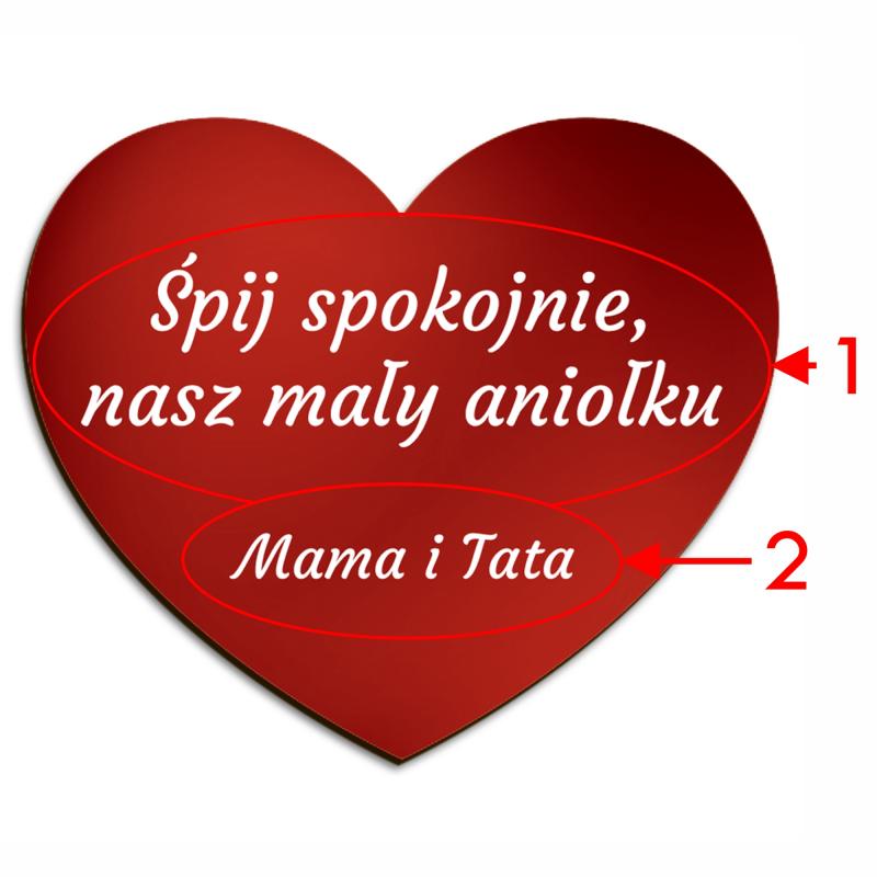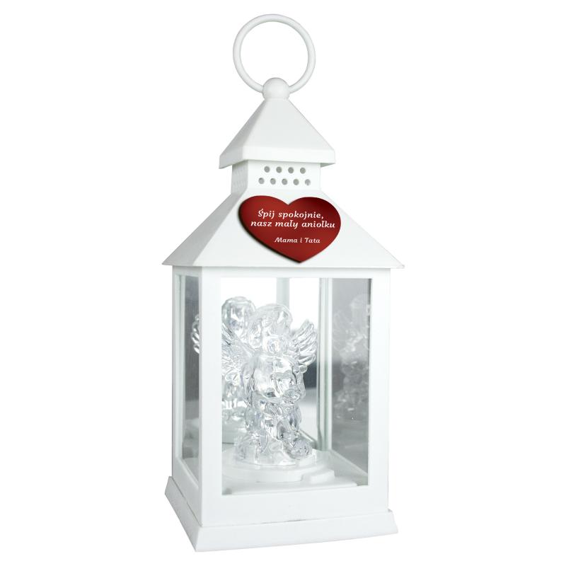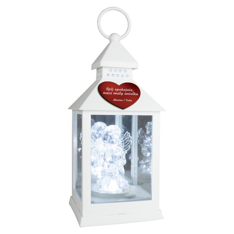 Na froncie latarenki znajduje się serduszko z napisem „Śpij spokojnie, nasz mały aniołku – Mama i Tata”, nadające jej wyjątkowego, osobistego charakteru.