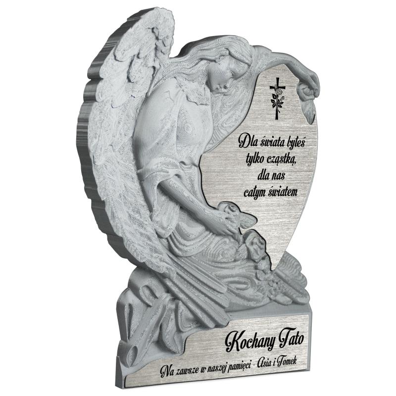 Elegancka figurka wykonana w odcieniach srebra, ozdobiona delikatnym motywem skrzydeł anioła i subtelnymi detalami. Idealna jako pamiątka pełna emocji, która upamiętnia bliską osobę.