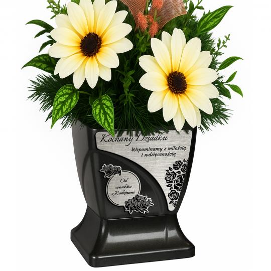 Misa nagrobna to elegancka i trwała dekoracja, która w piękny sposób upamiętni bliskich. Wykonana z solidnych materiałów, odporna na warunki atmosferyczne, zachowa estetyczny wygląd przez długi czas.